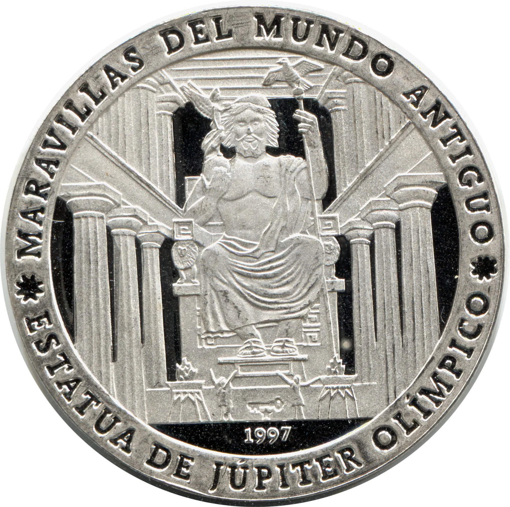 Jupiter statue in temple, series name curved above, name below, mintmark and date beneath.