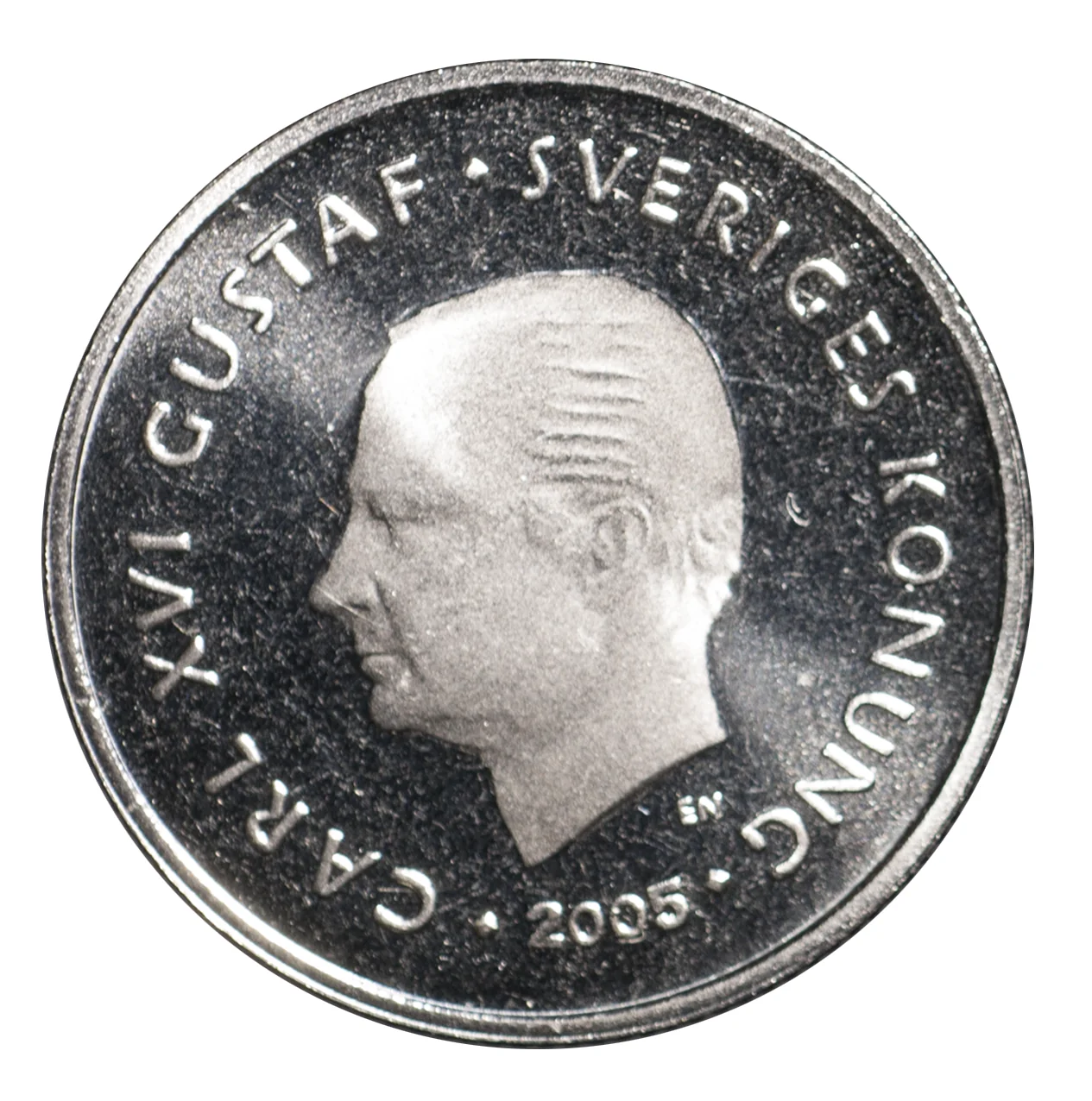 Royal crown divides mint mark and Riksbank governor's initial. King's motto above, value below.