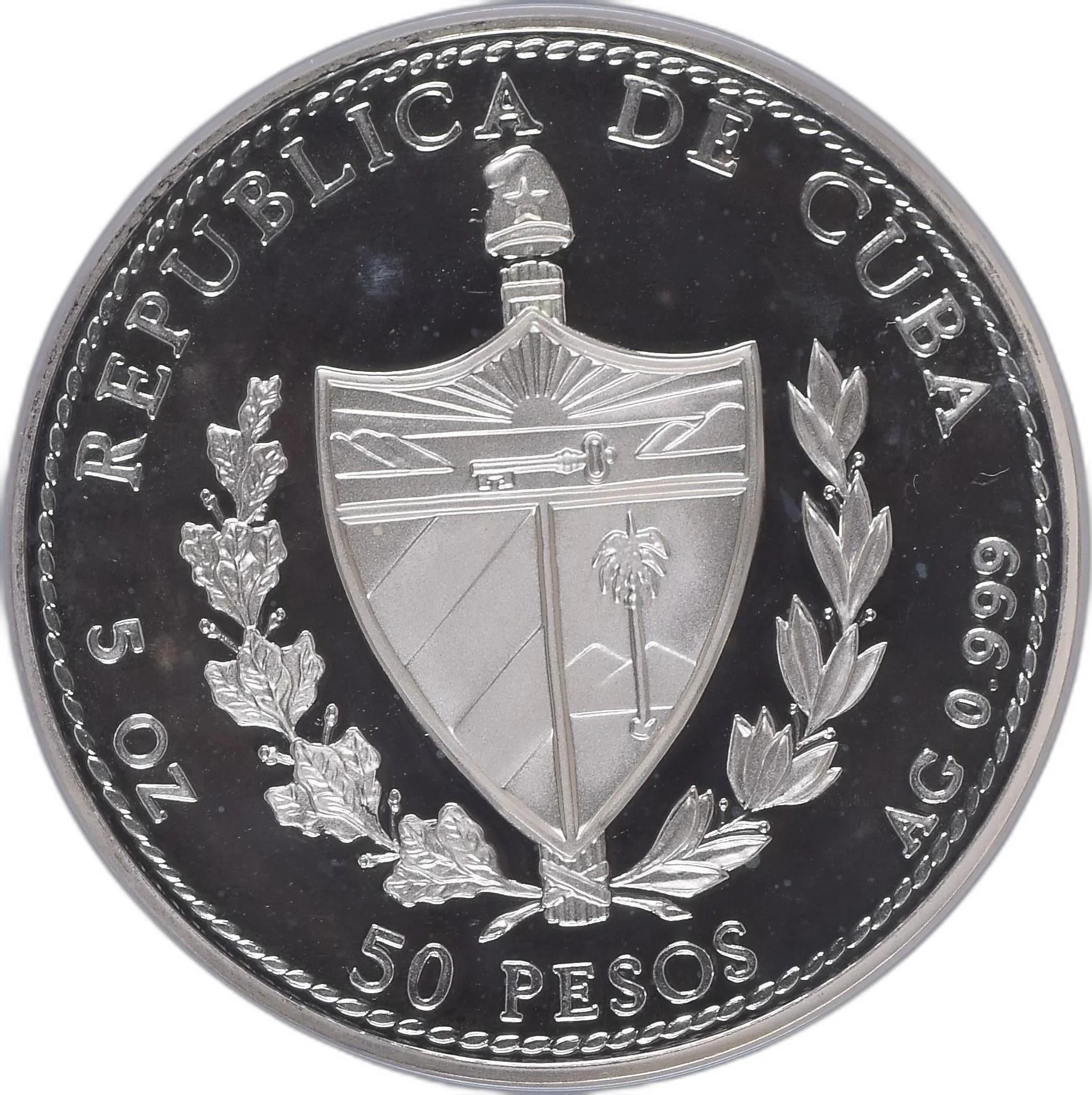 Cuban coat of arms with country name above, face value below, and weight/fineness on sides. Identical to KM# 596 but with updated face value and weight.
