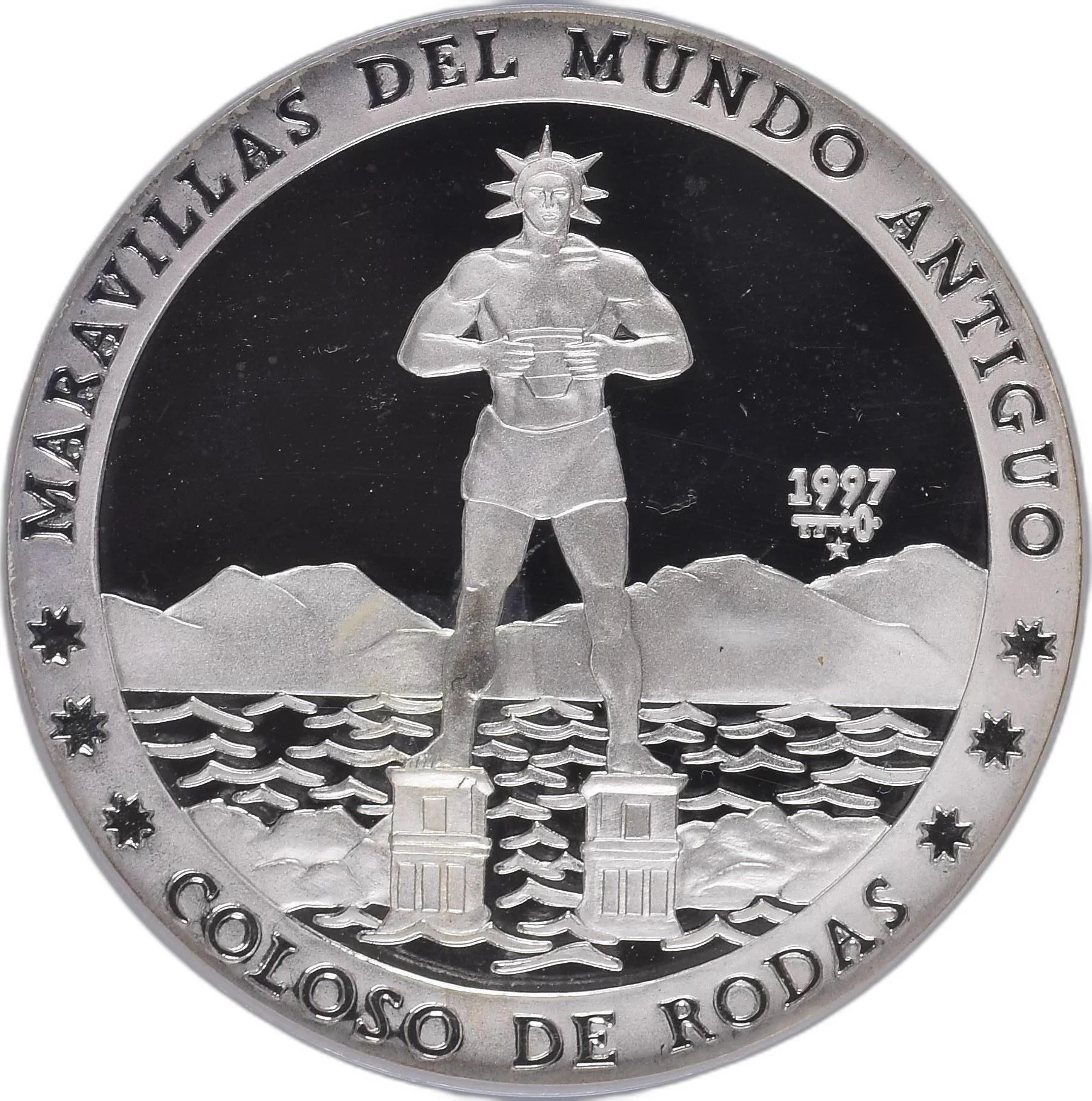 Colossus of Rhodes statue over water; circular legend with event, place, date, and mintmark. Design matches KM# 596.