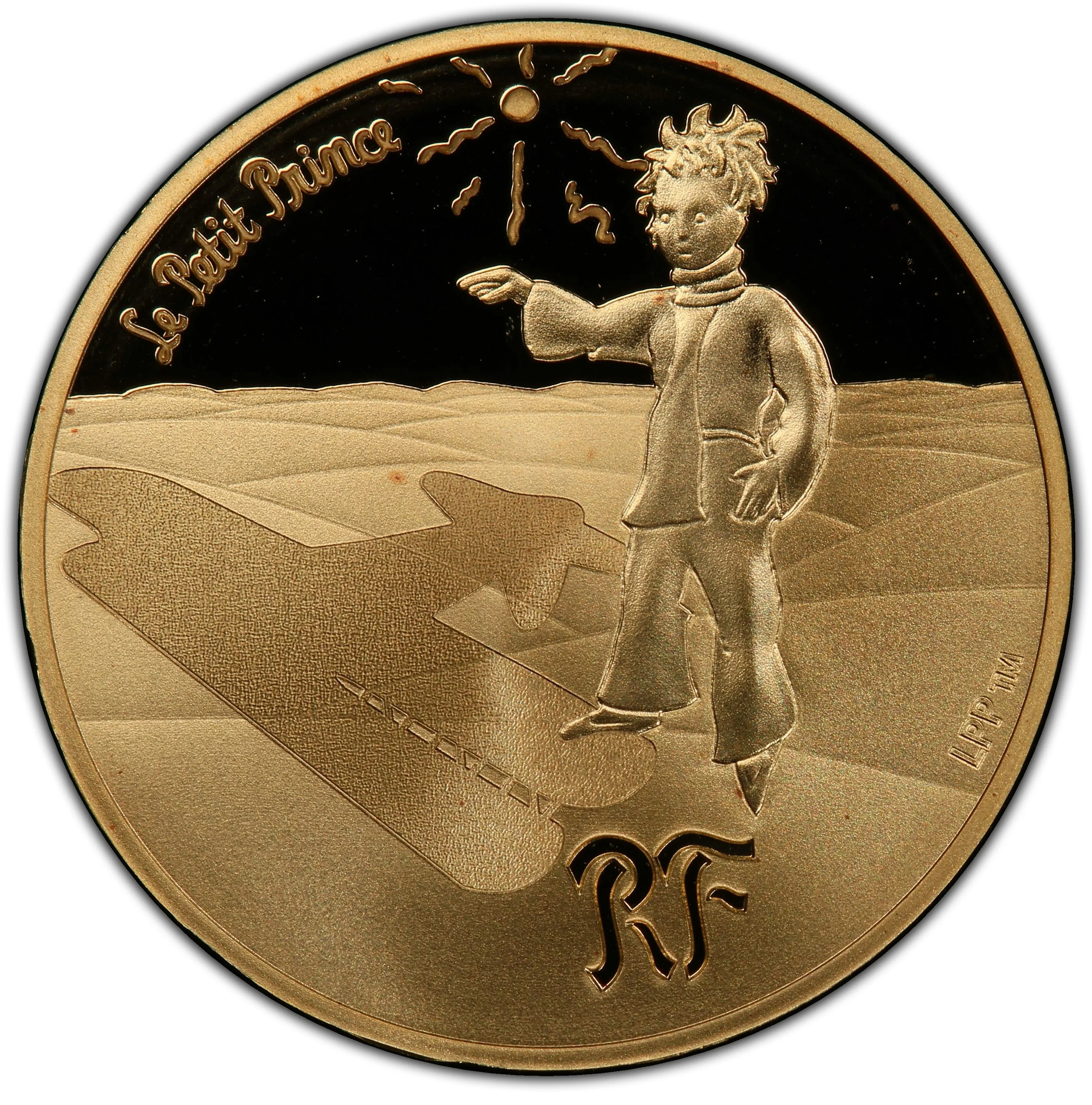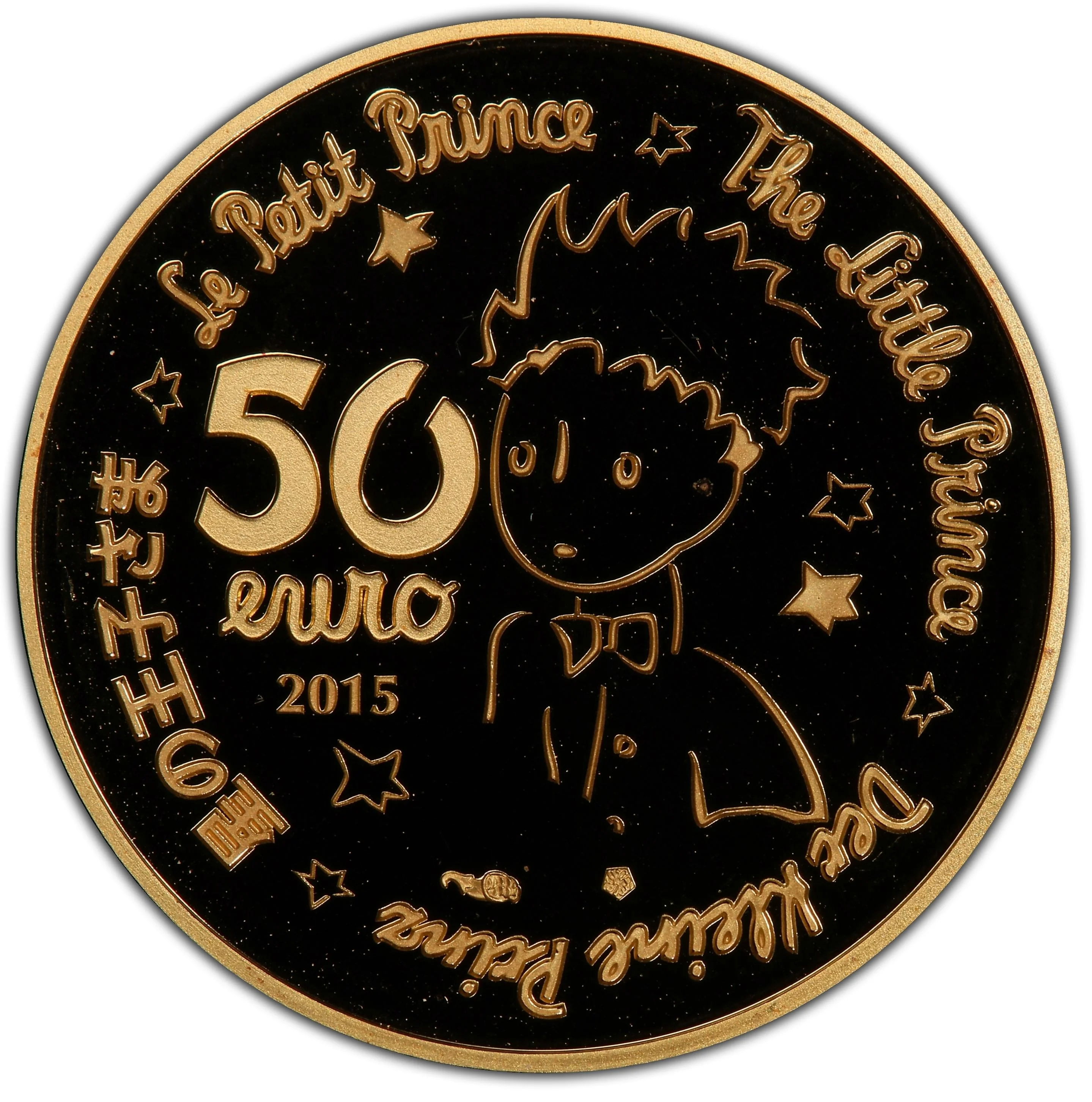 The Little Prince's head encircled by his title's multilingual translations, alongside the coin's face value and issue year.