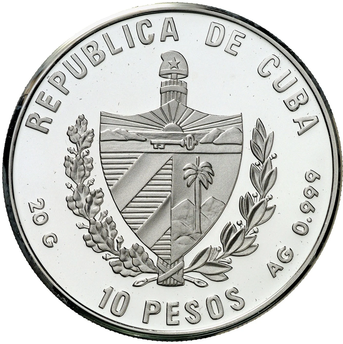 Cuban coat of arms with curved country name above, face value below, and weight and fineness on the sides.