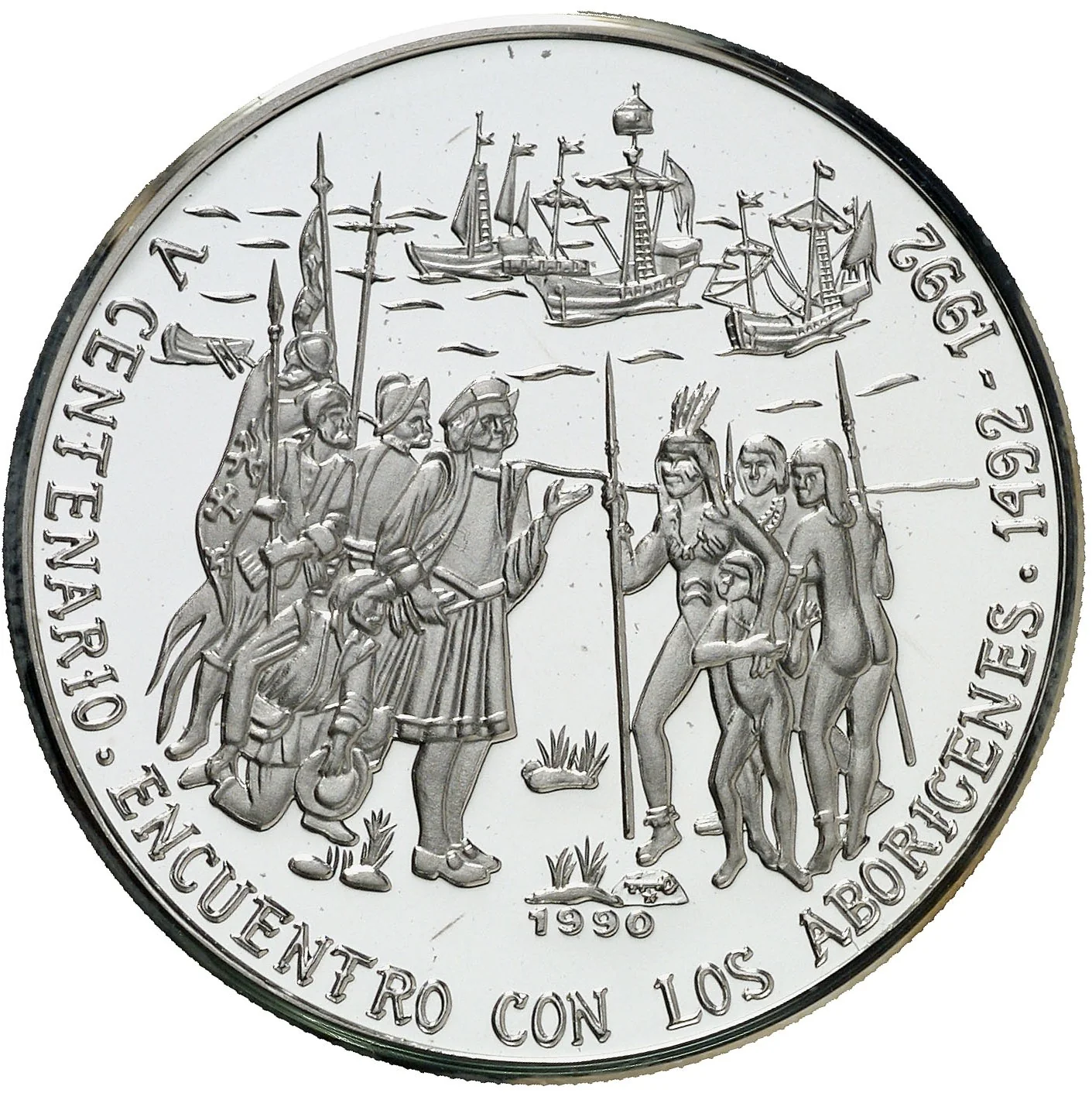 Columbus meeting natives with ships behind. Curved legend notes event and dates. Mintmark and issue date below.