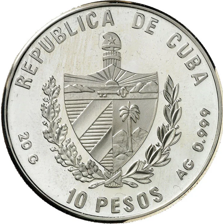 Cuban coat of arms with curved country name above, face value below, and weight and fineness on the sides.