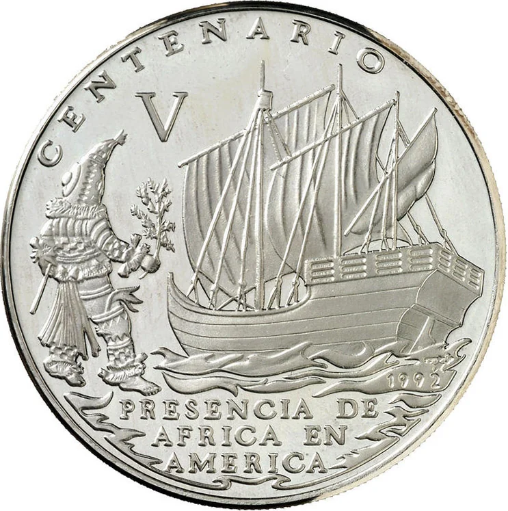 Left: African costume. Right: ship at sea. Top/bottom: legends. Lower right: mintmark and date.