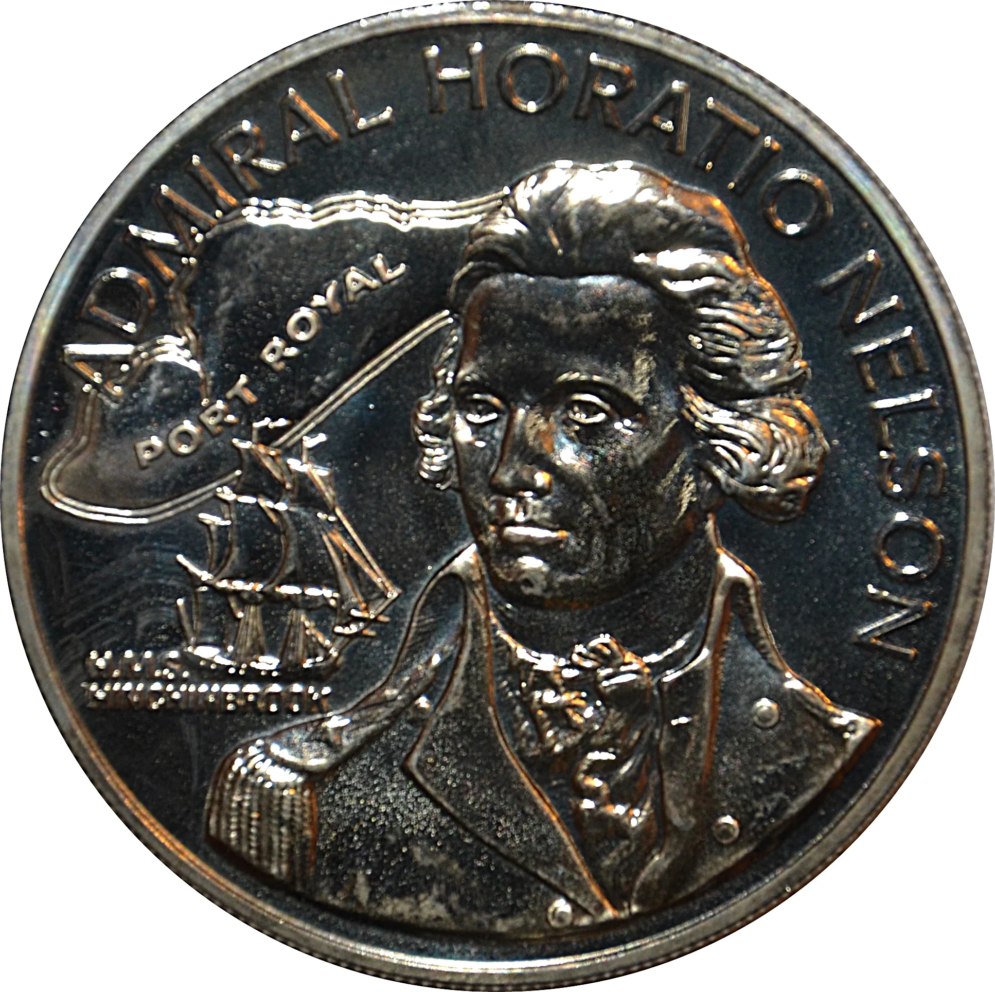 Admiral Nelson's uniformed bust, facing front left, with a ship and map behind.