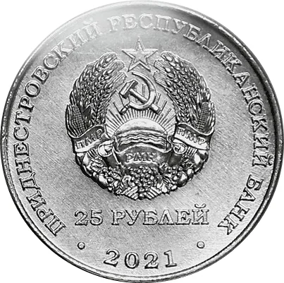 State Emblem of the Transnistrian Moldavian Republic. Circular inscription: above, "PRIDNESTROVSKIY RESPUBLIKANSKIY BANK" (Transdniest Republican Bank); below, "25 RUBLEY" (25 Roubles). Beneath the emblem, the year "2021".
