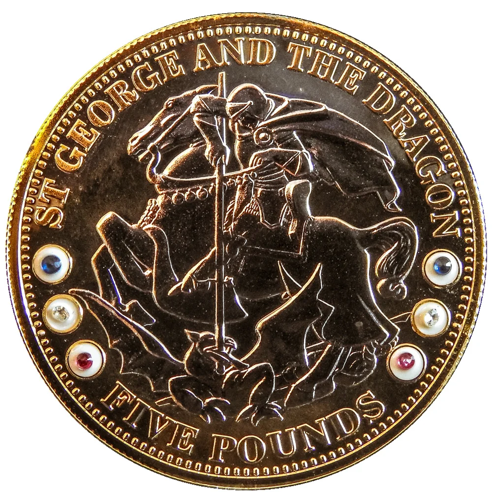 Saint George slaying the dragon in rhodium-platinum, flanked by sapphire, diamond, and ruby.