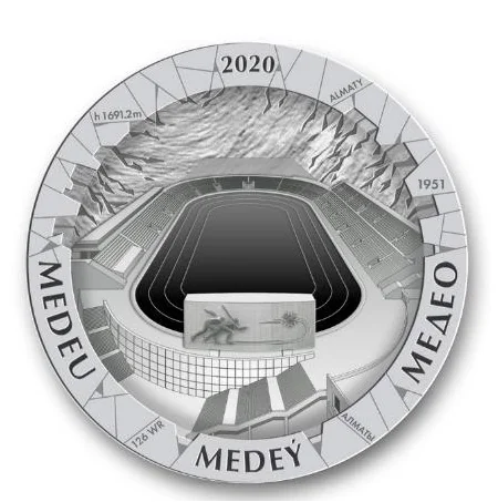 The "Medeo" skating rink against a mountain backdrop. The coin's rim features inscriptions of the mint year, rink opening year, world record count, elevation, and the rink's name and location in Kazakh, Russian, and English.