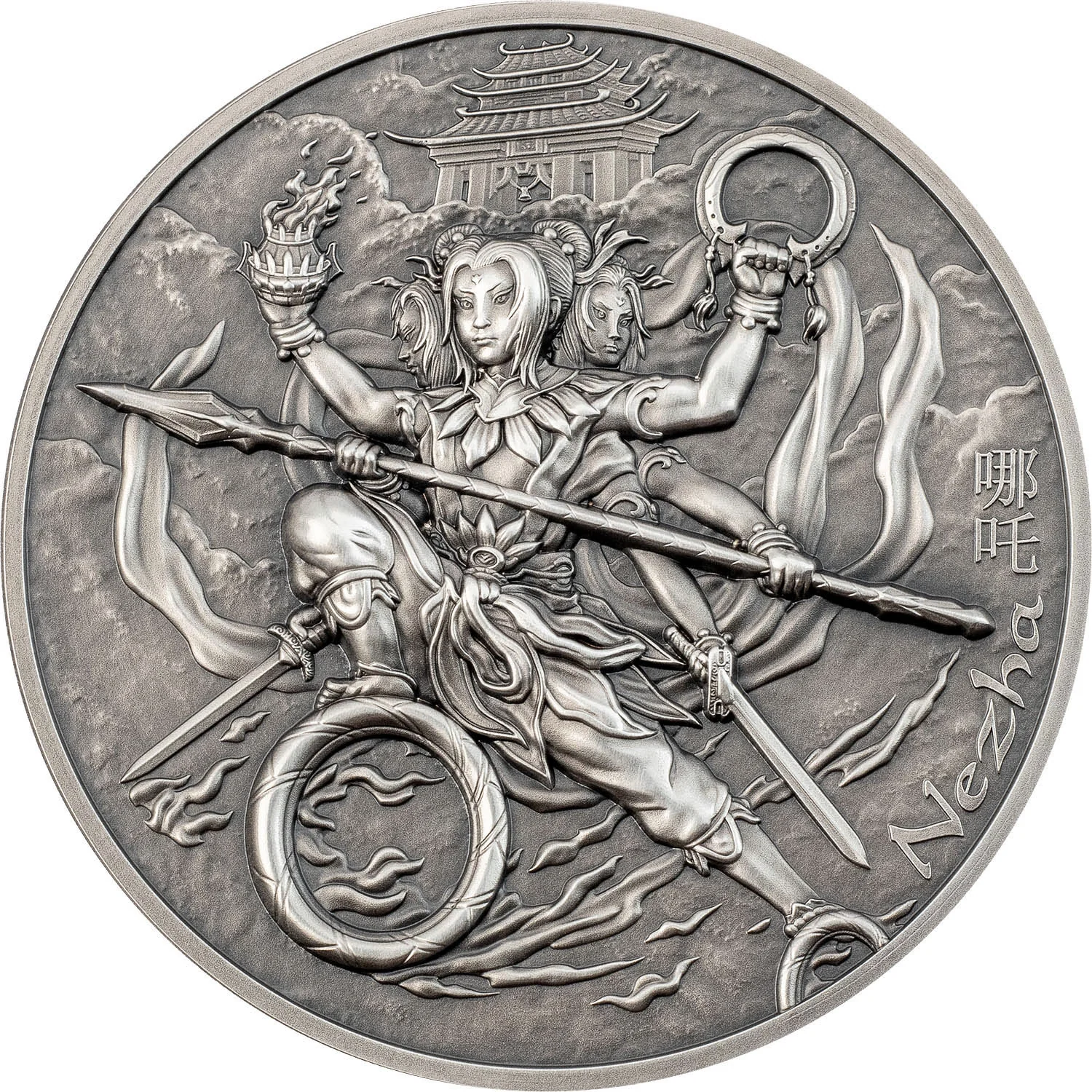 Nezha, a three-headed, six-armed youth, wields a fire-tipped spear and swords, rides wind-fire wheels, and wears a red armillary sash.