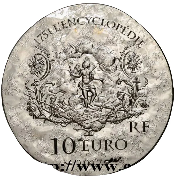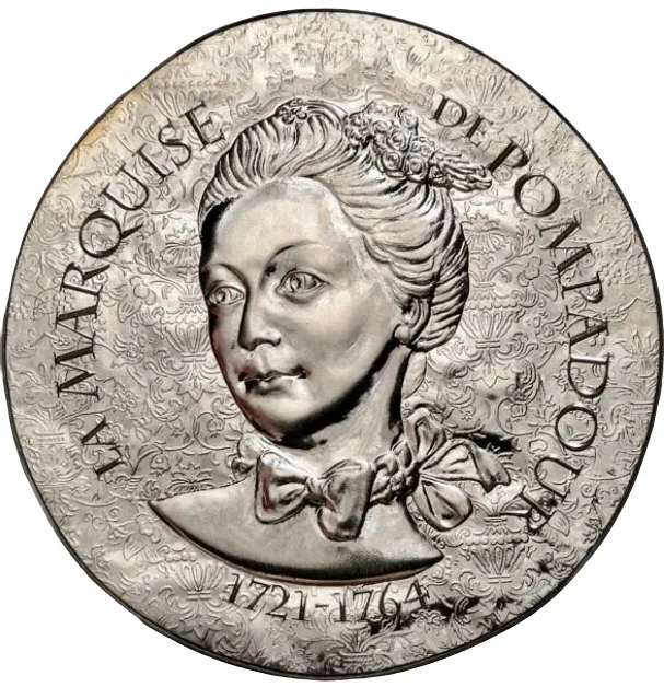 The reverse allegorizes the Marquise's role in protecting the arts and publishing the *Encyclopédie*.