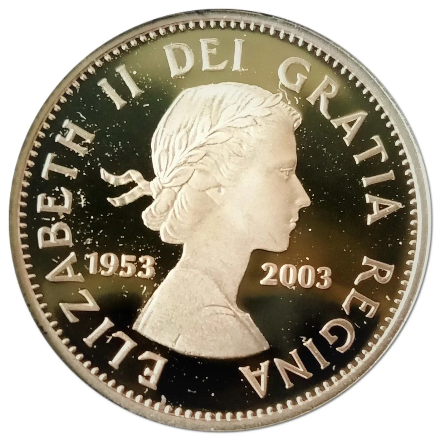 Young bust of Elizabeth II facing right, wearing a wreath, with dates 1953–2003.