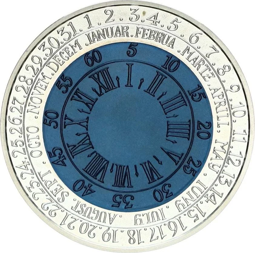 The reverse shows a clock dial with hours and minutes in the center, and months with dates in the outer ring.