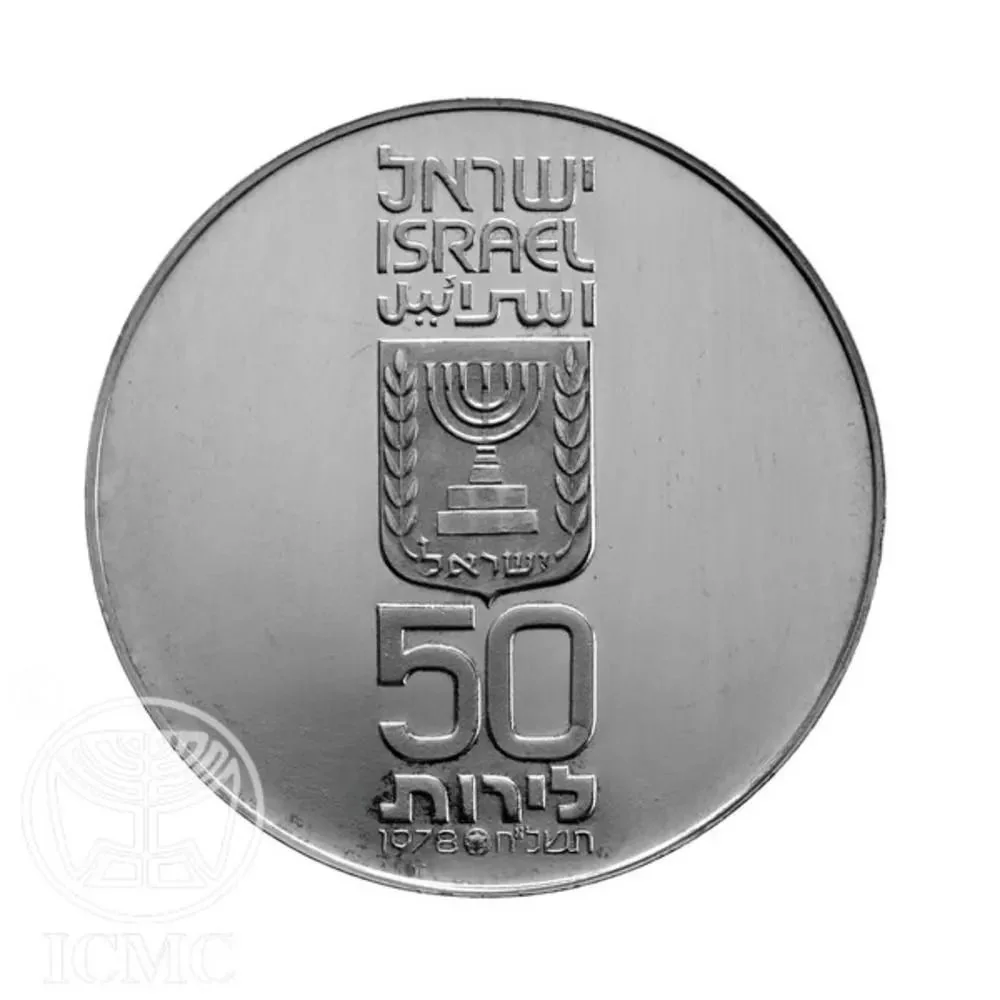 "50 Lirot" face value. Israel State Emblem, "Israel" in Hebrew, Arabic, and English, and mint year.