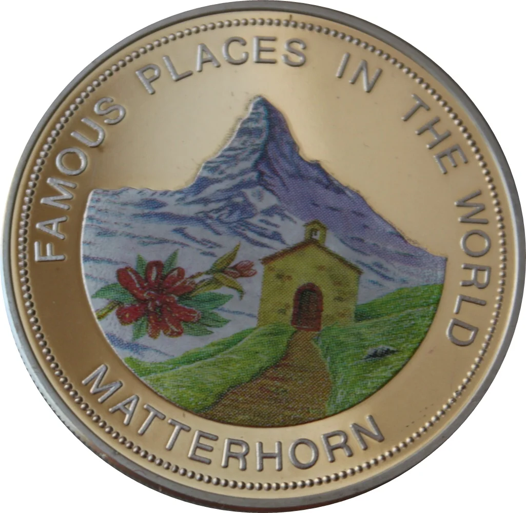 Colored. Path to a yellow house with a red flower at right. The Matterhorn in the background. Beaded circle around the rim.