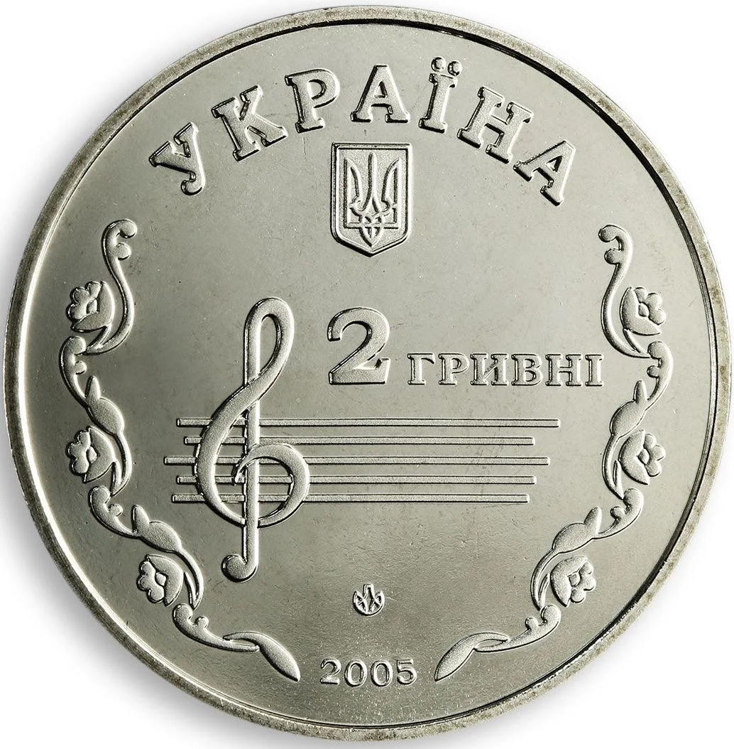 A semicircular "УКРАЇНА" inscription sits above Ukraine's small National Emblem. The background features music lines with a folk-patterned treble clef. Above the lines is the face value "2 ГРИВНІ," and below are the Mint logo and the year 2005.