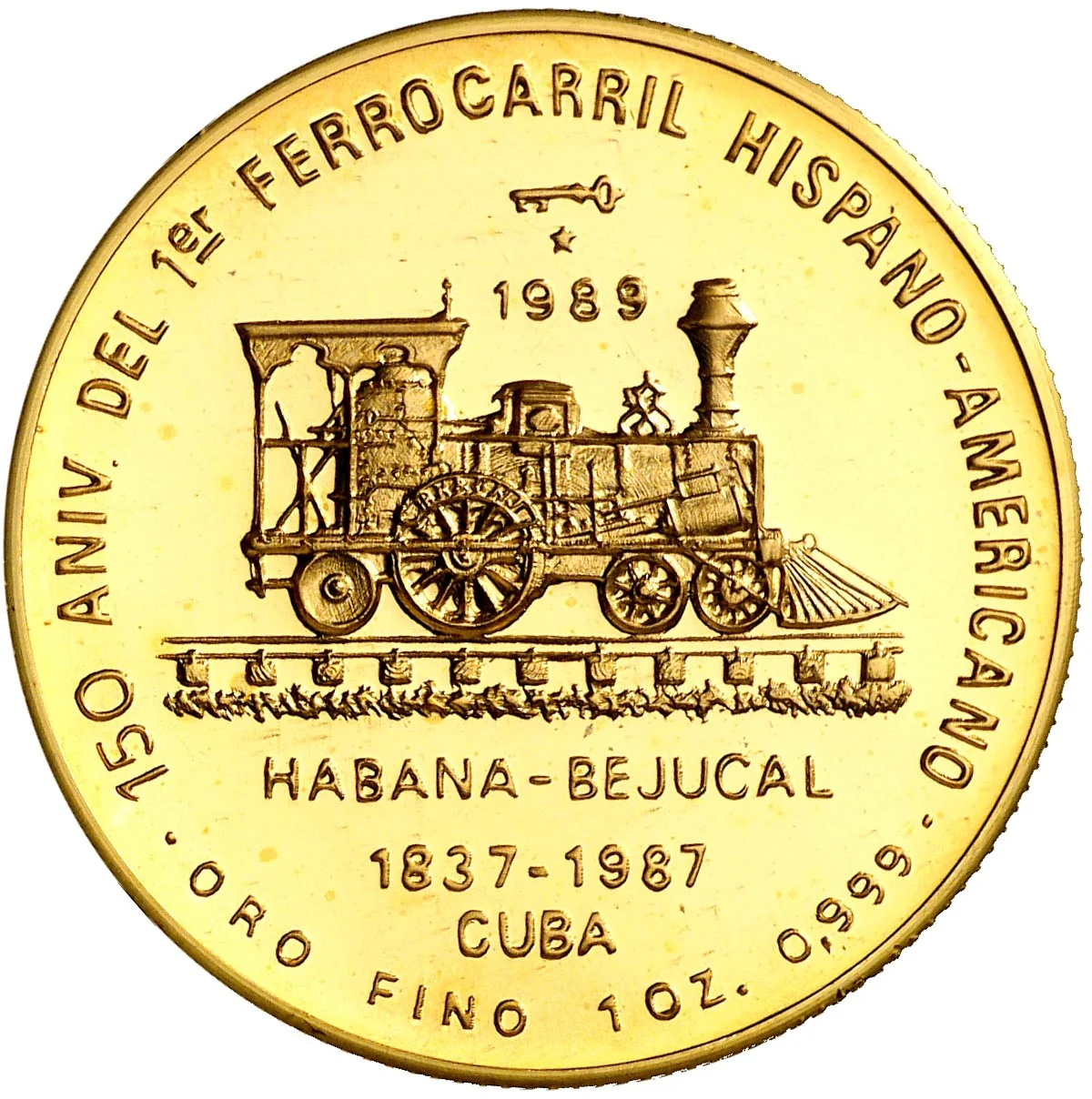 Locomotive from Cuba's first railroad (Havana-Bejucal). Event name arches over image with mintmark and date. Route and country are below image, with weight and fineness at the bottom.