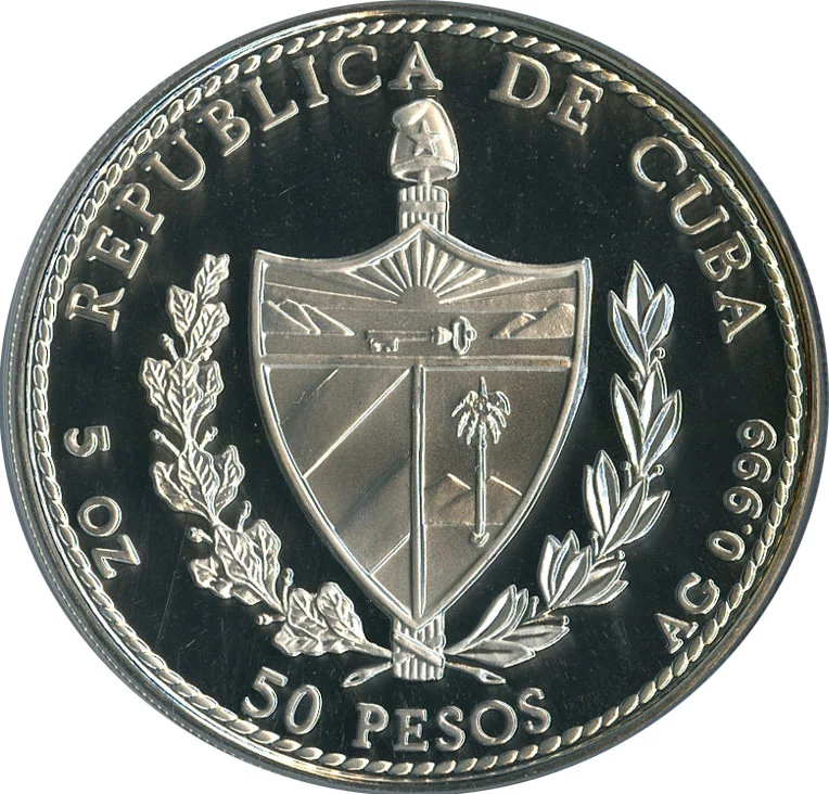 Cuban coat of arms with country name above, face value below, and weight/fineness on the sides.