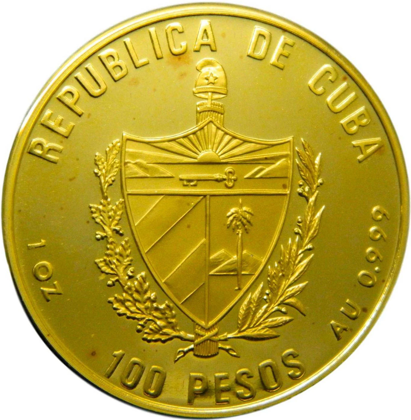 Cuban coat of arms with country name above, face value below, and weight/fineness on the sides.
