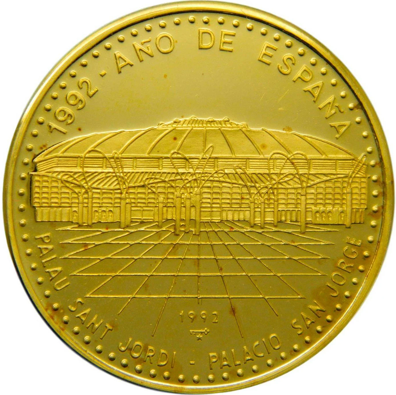 Image of Barcelona's Palau Sant Jordi. Series name curves along the top; location is below in Catalan and Spanish, with date and mintmark above.