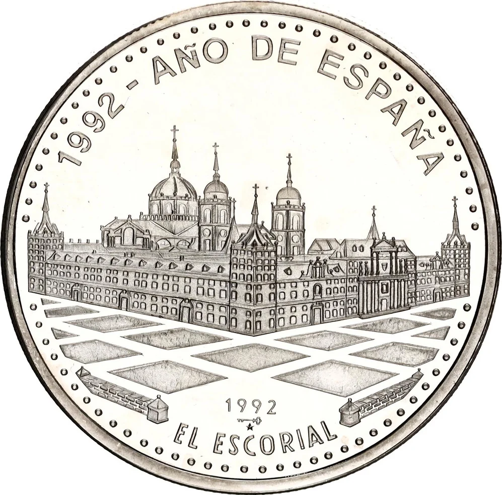 El Escorial, Madrid. Series name arched above, date, mintmark, and location below.