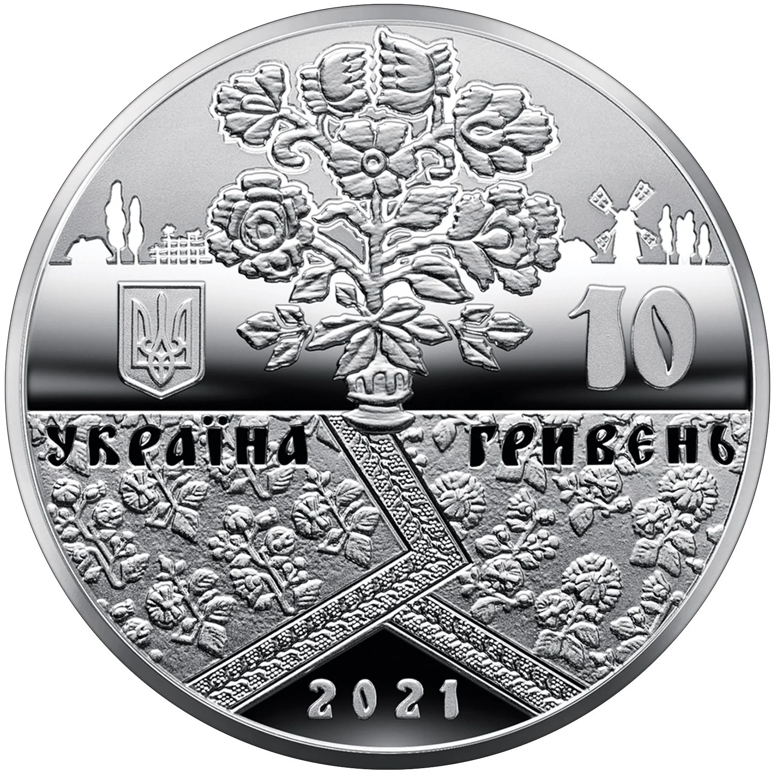 Centered against a smooth landscape outline is Ukraine's small coat of arms (left), the traditional Tree of Life symbol (center), and the face value 10 (right). Against stylized carpets are the legends "УКРАЇНА" (left) and "ГРИВЕНЬ" (right), with the issue year 2021 below.