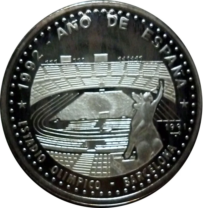 Olympic Stadium Barcelona: curved legend above, name and place below, issue date and mintmark at right.