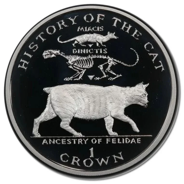 Series name above; ancient cat ancestors and a Manx cat vertically flanked; coin details below a dividing line.