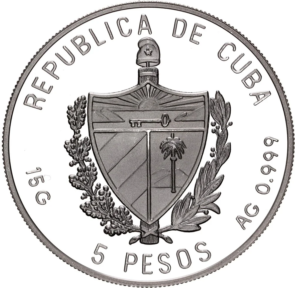 Description: Cuban arms with country name above and face value below; sides show weight and fineness. Design matches KM# 524 but with updated face value and weight.