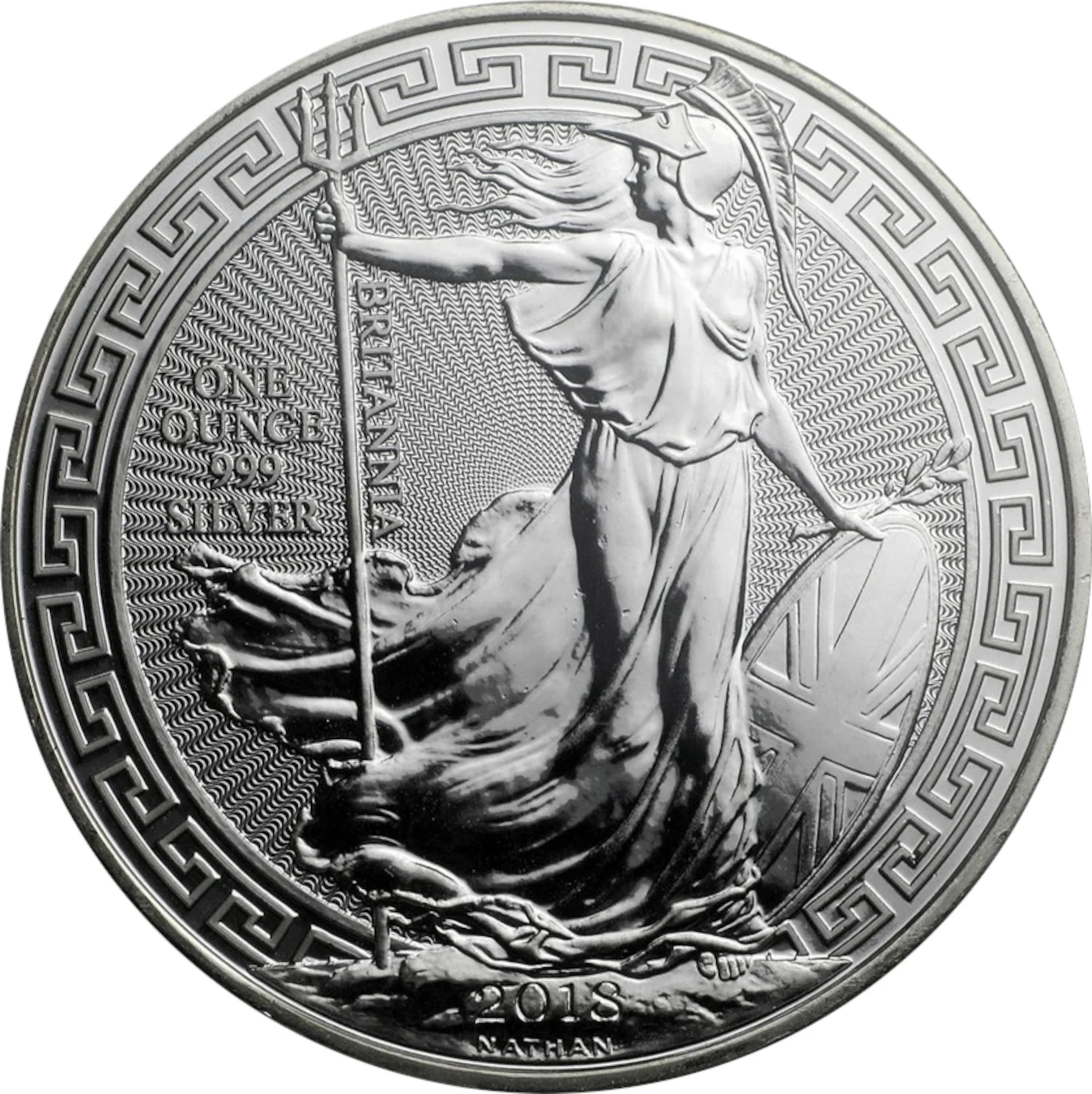Britannia stands guard, wearing a Corinthian helmet and holding a trident. She protects the coast with a Union Flag shield, framed by an oriental-patterned border.