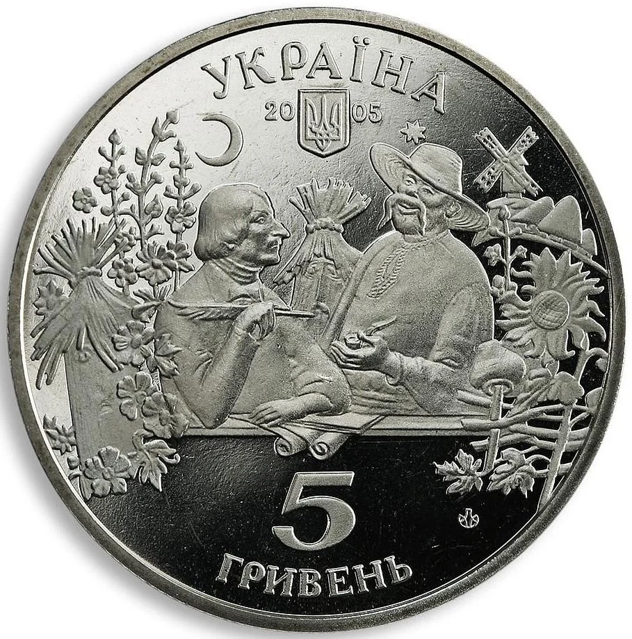 Against a Ukrainian landscape, Nikolai Gogol and his character Rudy Panko are depicted. Above them is the semicircular inscription "УКРАЇНА," below is the small National Emblem, the year 2005, "5 ГРИВЕНЬ," and the NBU Mint logotype.