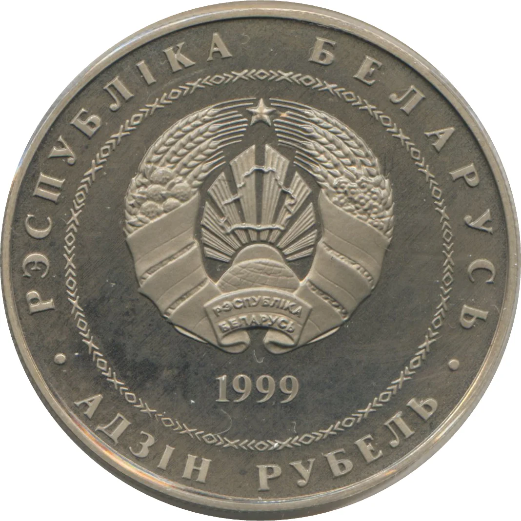 Description: The circular ornament features the relief of the State Coat of Arms, the year of issue below, and rim inscriptions: "РЭСПУБЛIКА БЕЛАРУСЬ" above and "АД3IН РУБЕЛЬ" below.