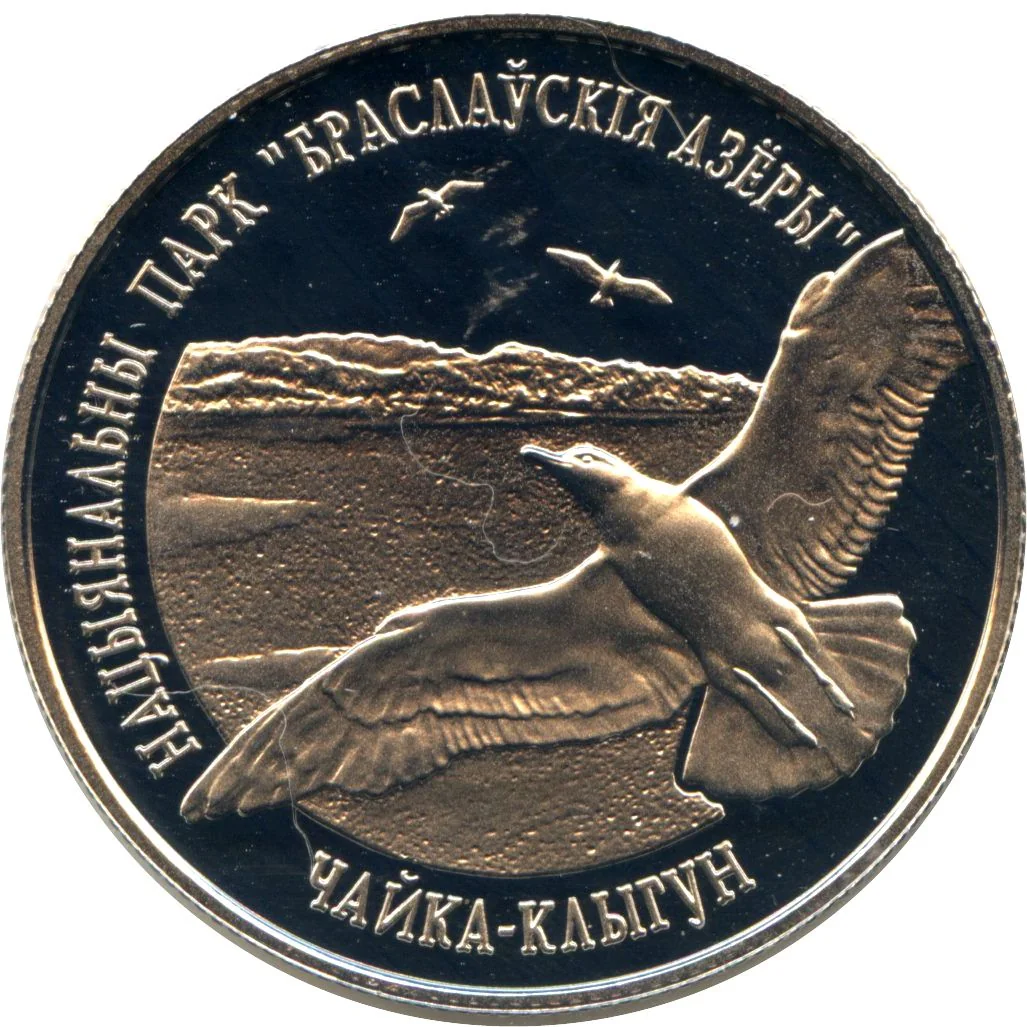 A herring gull in relief over a mirrored lake. Around the rim: above, "НАЦЫЯНАЛЬНЫ ПАРК 'БРАСЛАЎСКІЯ АЗЁРЫ'"; below, "ЧАЙКА КЛЫГУН".