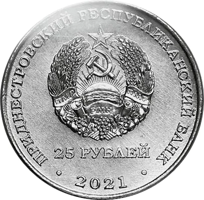 State Emblem of the Transnistrian Moldavian Republic. Circular inscription: above, "PRIDNESTROVSKIY RESPUBLIKANSKIY BANK" (Transdniest Republican Bank); below, "25 RUBLEY" (25 Roubles). Beneath the emblem, the year "2021".