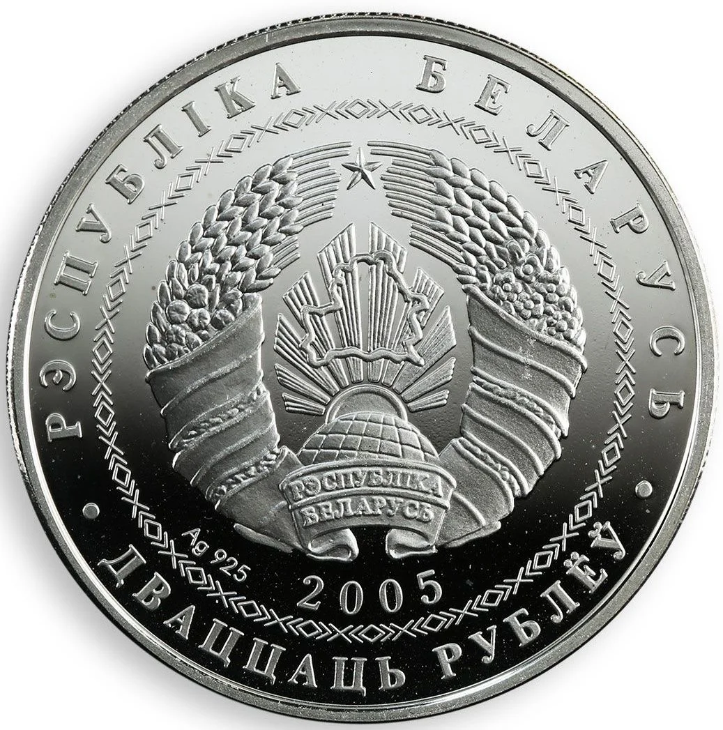 Description: The circular ornament features the relief of the State Coat of Arms. Below are the issue year and alloy standard. The rim inscriptions: above, "РЭСПУБЛIКА БЕЛАРУСЬ" (REPUBLIC OF BELARUS); below, "ДВАЦЦАЦЬ РУБЛЁЎ" (TWENTY ROUBLES).