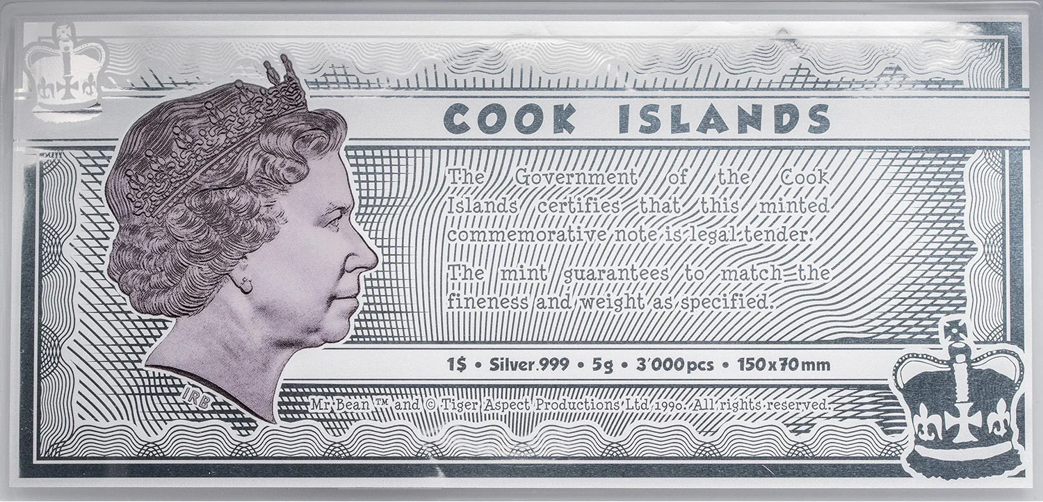 Description: Mr. Bean bust on a UK flag. Teddy, his car with a rooftop sofa, his signature, and a crown surround him.