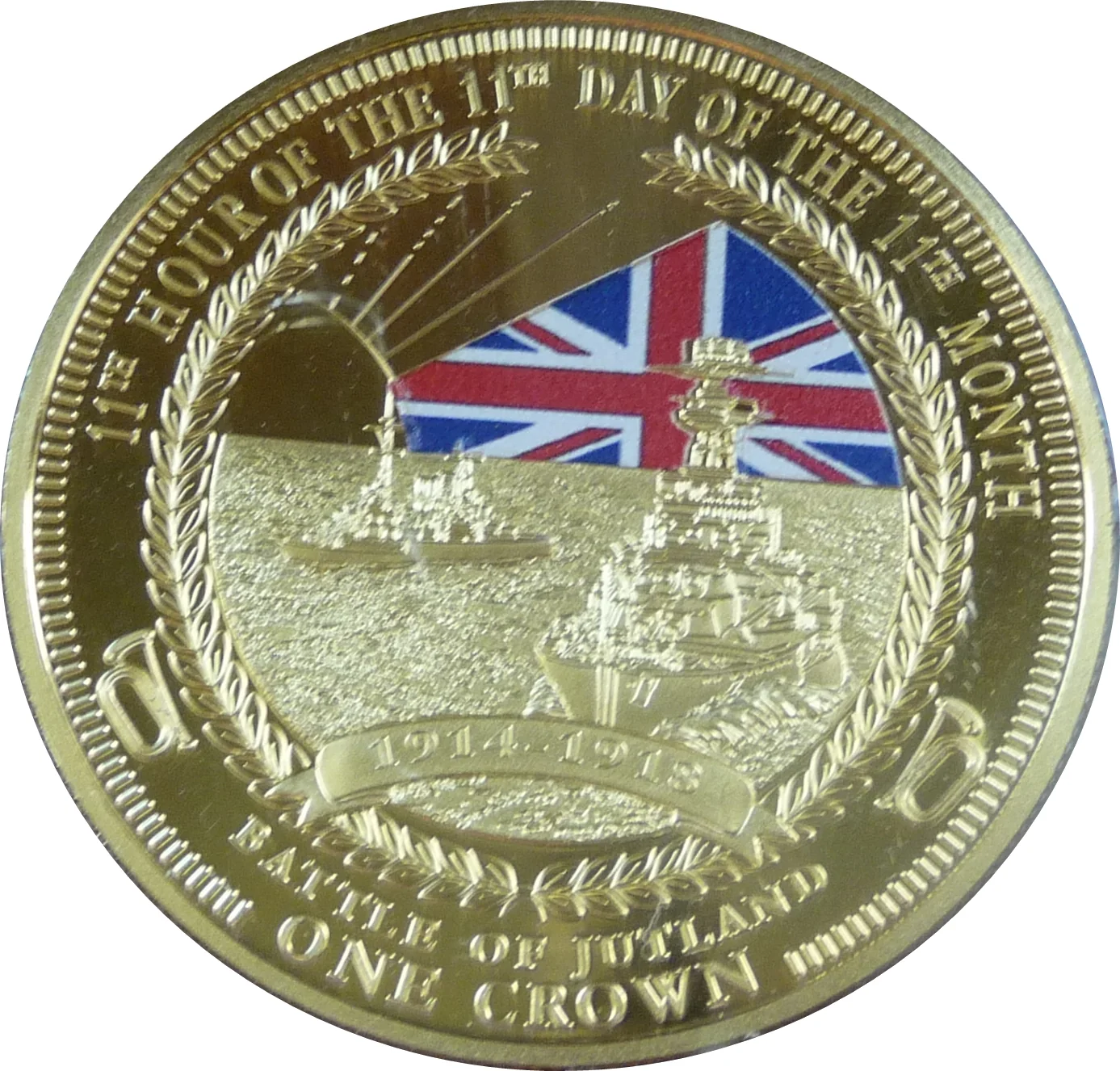 Warships under a Union flag, sunrise backdrop, dates in a wreath above value.