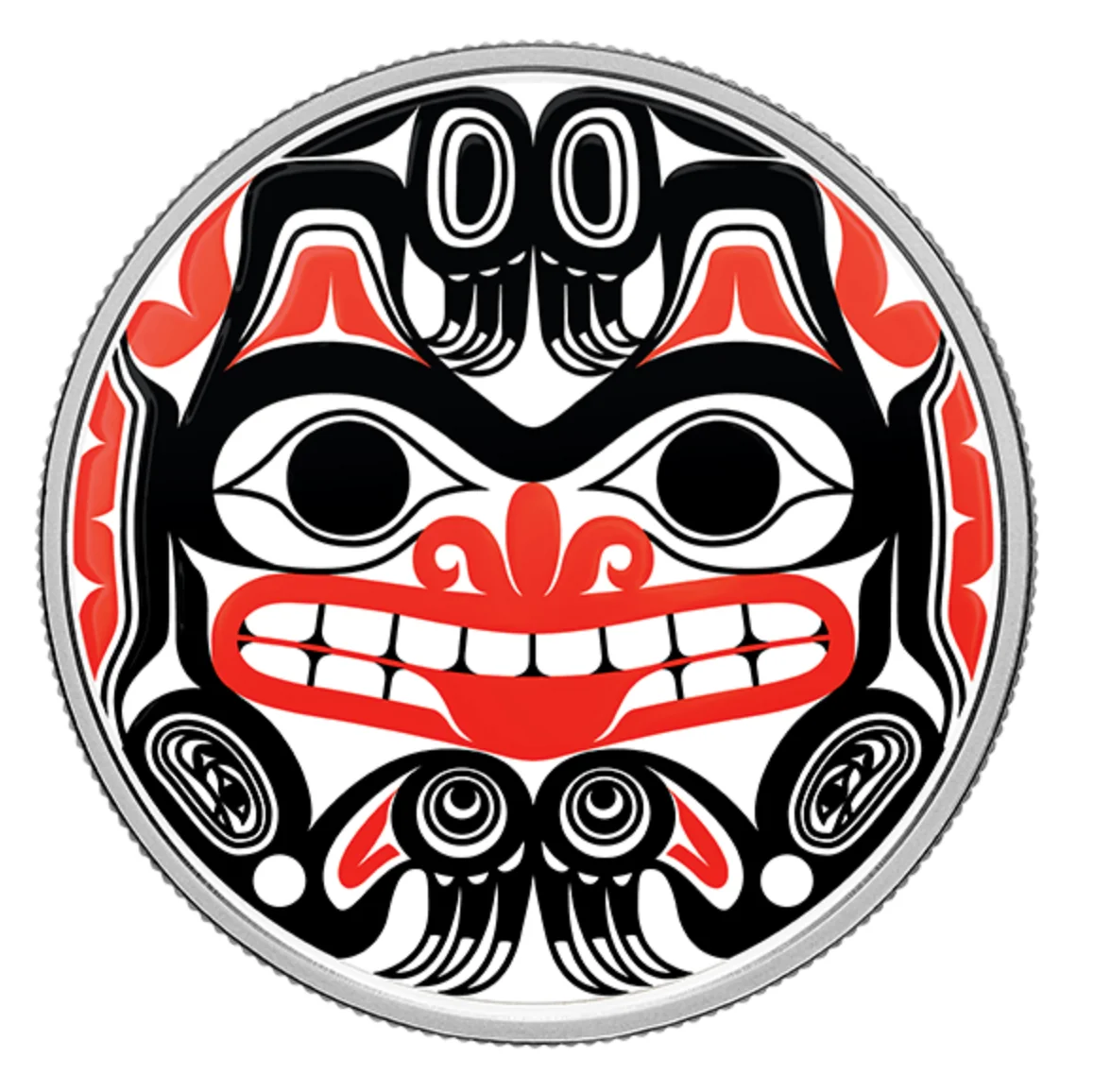 The reverse features Bill Reid's engraved Haida Grizzly Bear in red, white, and black.