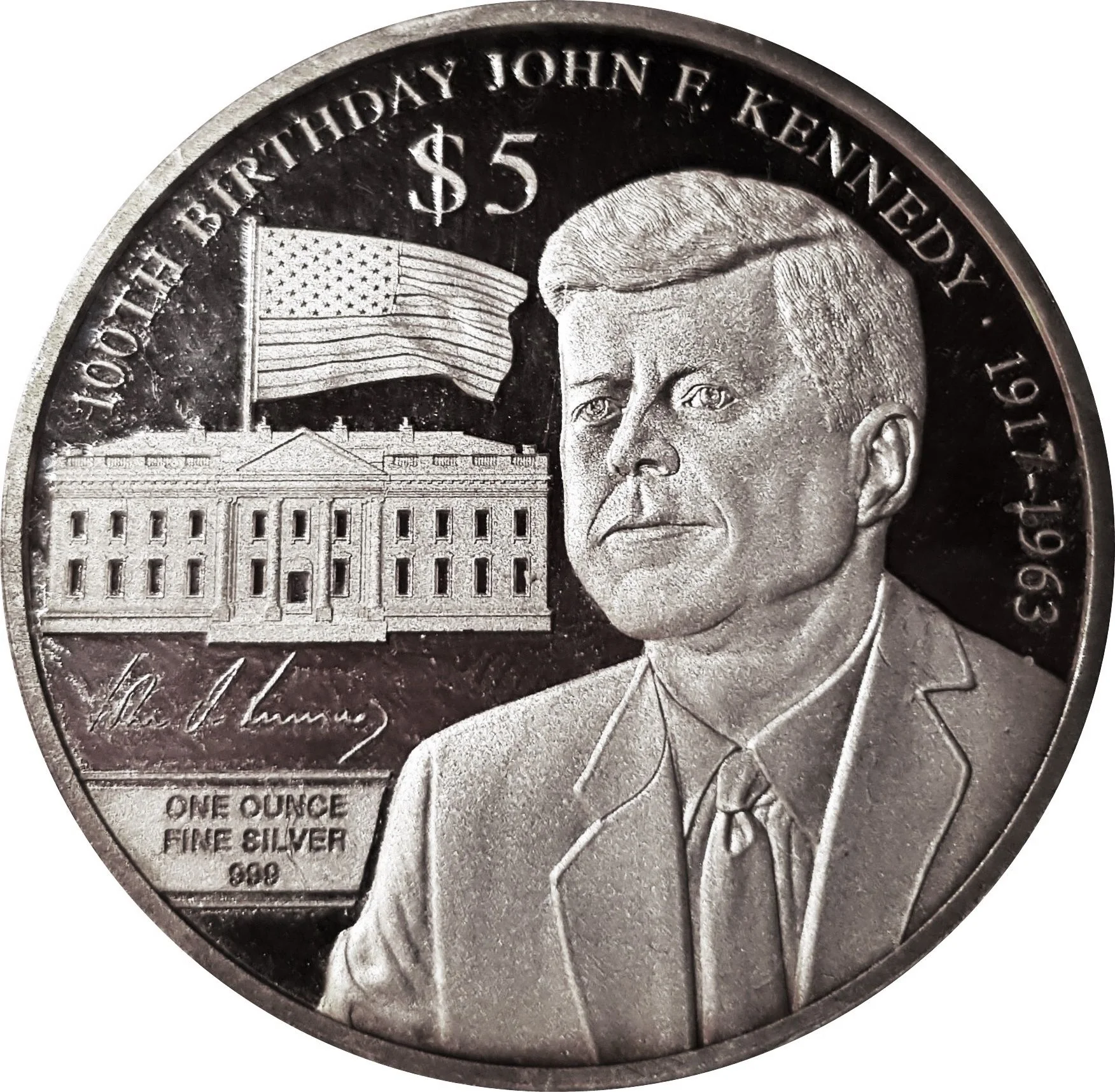 JFK bust facing left, with White House and flag behind.