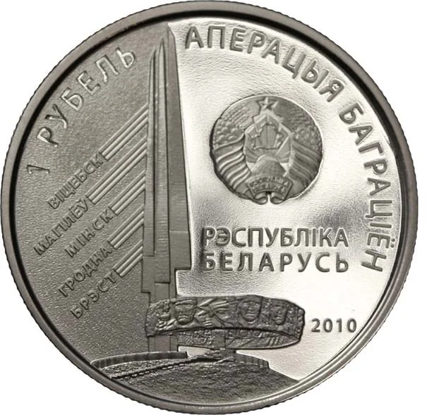 Right: State Coat of Arms and "РЭСПУБЛІКА БЕЛАРУСЬ". Left: Курган Славы monument with city names: ВІЦЕБСК, МАГІЛЁЎ, МІНСК, ГРОДНА, БРЭСТ. Circumferential inscriptions: "1 РУБЕЛЬ", "АПЕРАЦЫЯ БАГРАЦІЁН", and the year.