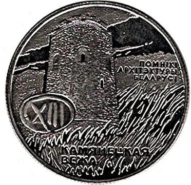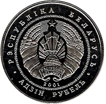 Circular ornament with relief State Coat of Arms. Below: year. Rim inscriptions: top – "РЭСПУБЛIКА БЕЛАРУСЬ", bottom – "АД3IН РУБЕЛЬ".