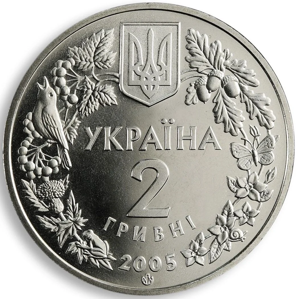 Encircled by flora and fauna, the small National Emblem of Ukraine and a legend are engraved.