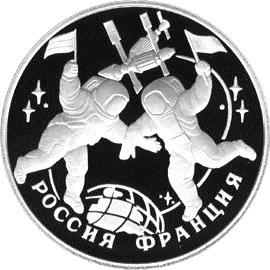 Two cosmonauts hold Russian and French flags against a space station, stars, and a stylized Earth. Below: "РОССИЯ-ФРАНЦИЯ".