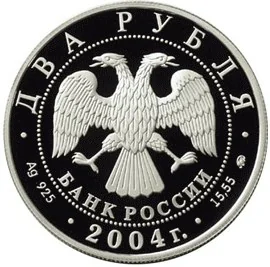 Center: Bank of Russia emblem (two-headed eagle, wings down, with "БАНК РОССИИ" below), within a dotted circle. Rim inscriptions: top – "ДВА РУБЛЯ", bottom – year "2004", left – metal/fineness, right – metal content/mint mark.