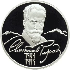 A portrait of S.N. Rerikh with his facsimile signature "СВЯТОСЛАВ РЕРИХ" and the dates 1904–1993, set against a mountain range.