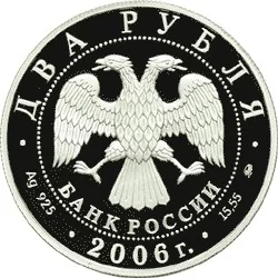 Center: Bank of Russia emblem (two-headed eagle, wings down, with "БАНК РОССИИ" below), circled by dots. Rim inscriptions: top – "ДВА РУБЛЯ", bottom – year "2006". Left: metal/fineness. Right: metal content/mint mark.