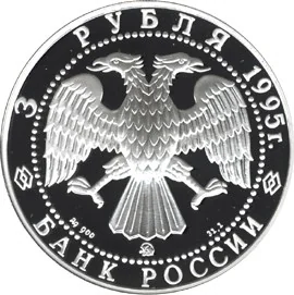 Center: Bank of Russia emblem (Bilibin's two-headed eagle), with metal details below. Inscriptions along the rim: "3 РУБЛЯ 1995 г." above, "БАНК РОССИИ" below, within a dotted circle.