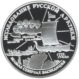Left: portraits of explorers Malygin, Ovtsyn, Chelyuskin, and the Laptevs. Center: a wooden coast-dweller vessel and a dog sled. Below: a map of the Siberian coast and the dates "1733-1743". Rim inscriptions: "EXPLORATION OF RUSSIAN ARCTIC" and "THE GREAT NORTHERN EXPEDITION".