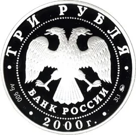 Center: Bank of Russia emblem (I. Bilibin's two-headed eagle) above "БАНК РОССИИ". Around the rim: top - "ТРИ РУБЛЯ", bottom - "2000", left - metal/fineness, right - metal content/mint mark.