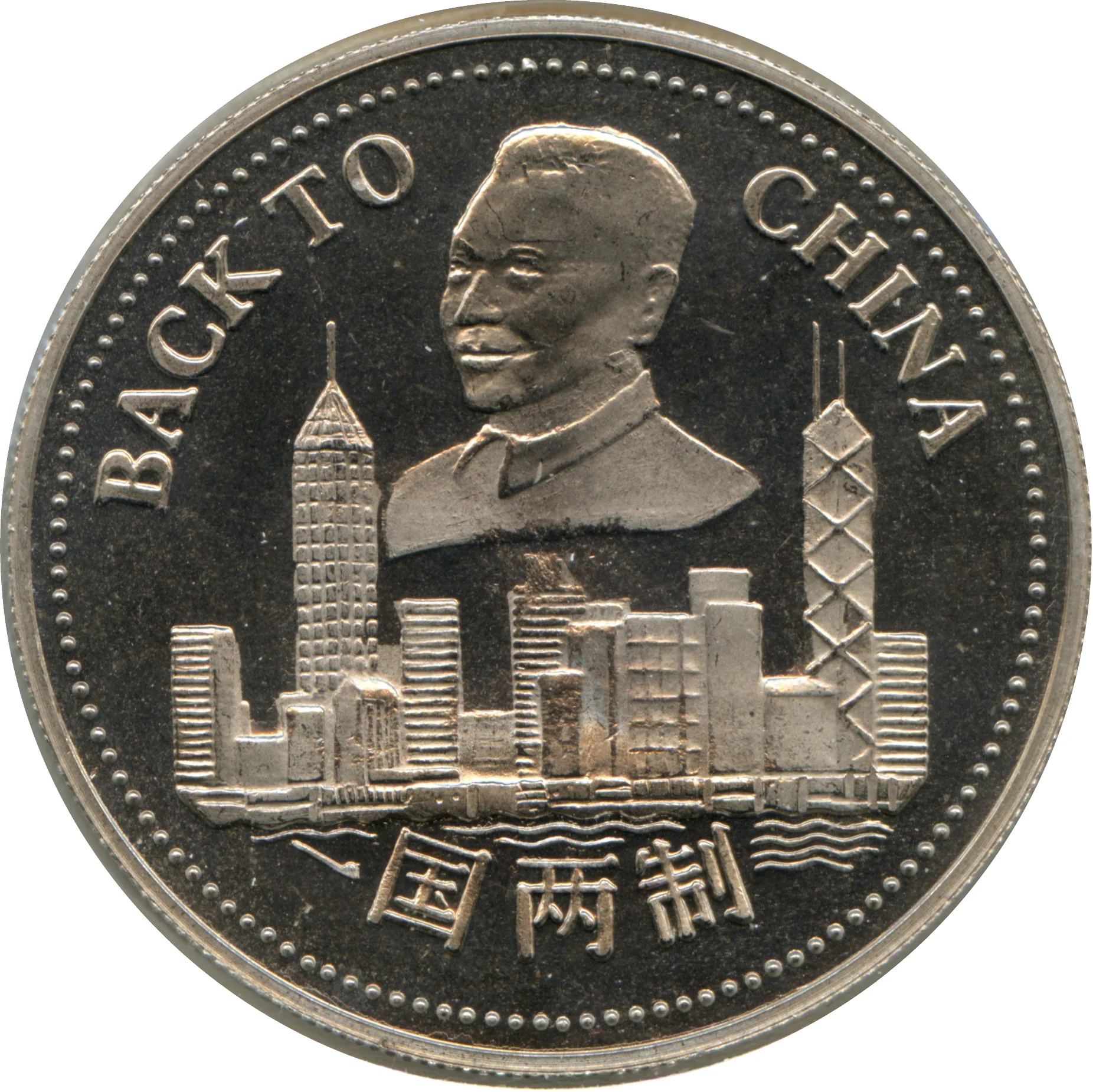 Hong Kong skyline, Tung Chee-hwa bust above, Chinese characters below, beaded rim.